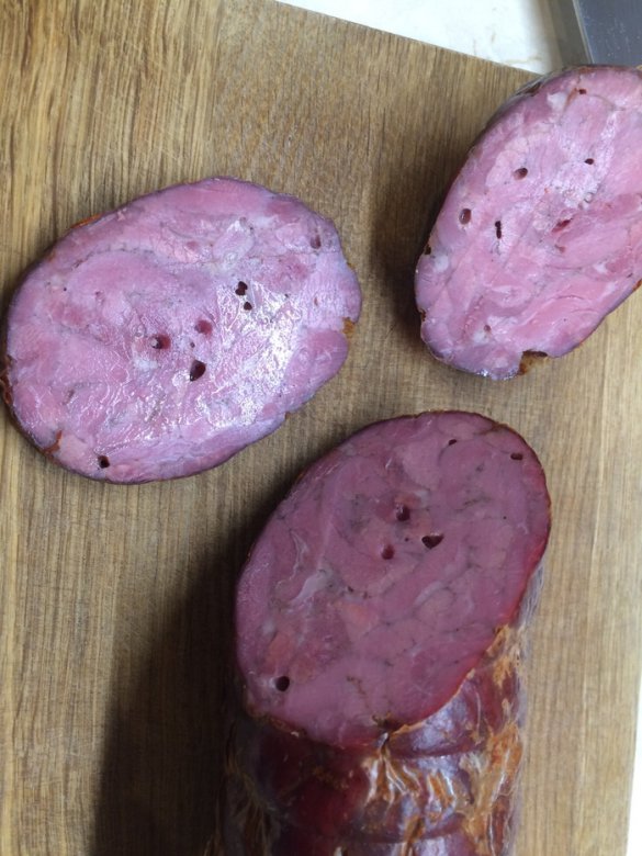 Ещё через сутки батон подвесил в комнате на несколько часов. Разогрел духовку, внизу установил противень с горячей водой и на решётку положил батон. Температуру выставил 80 градусов и контролировал электронным термометром, ДШ работает так, разогревается до 80, потом медленно остывает до 73 и так по кругу. Через час в батон воткнул щуп, температура была 51 градус, и примерно через 5-6 минут поднималась на 1 градус. По достижению 57 рост прекратился (прошло около двух часов), пришлось временно (на пару минут) повысить температуру до 90 градусов и рост продолжился, но на 60 градусах опять остановился (прошло около трёх часов). Повышение температуры до 90 и 100 градусов никак не повлияло, дело сдвинулось только при 120 градусах. В результате ветчина пробыла в духовке почти 4 часа. Получилась очень плотной, сочность есть, но не такая, как в магазине, верхний слой суховат.