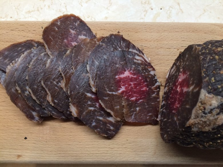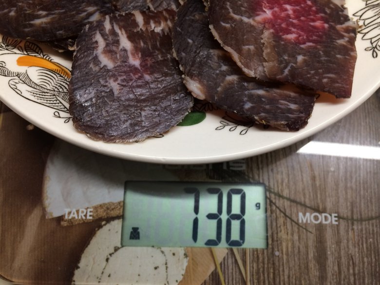 Мясо потеряло в весе около 230 грамм, забыл сфотать сразу, пару кусочков уже съел. В этот раз мясо получилось не такое плотное, тонкие ломтики нарезались спокойно.