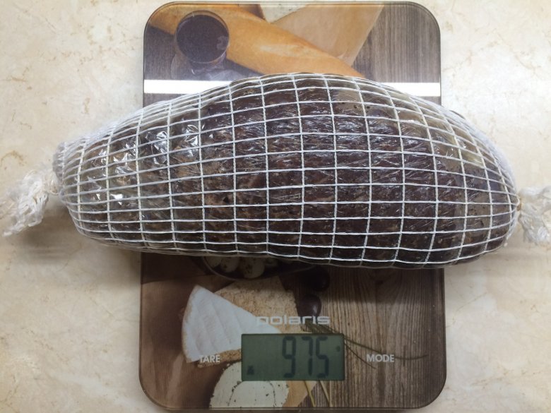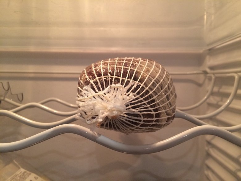 Укутал просоленное мясо в коллагеновую плёнку и через трубу упаковал в сетку, без всяких нервов и мучений. И дальше отправил в холодильник на 3 недели.
