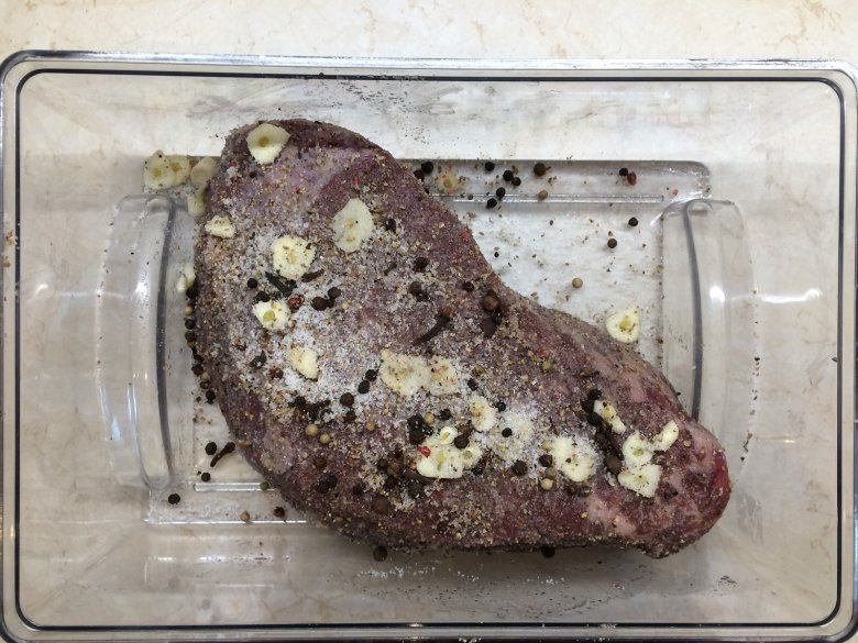 Со всех сторон обвалял в соли и специях, положил в контейнер и отправил в холодильник на 10 дней. Периодически переворачивал и массировал (раза 3 вроде).