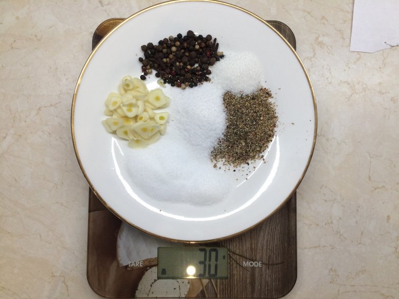 На 1 кг мяса взял 30 грамм соли, 20 грамм нитритной (смесь) и 10 грамм поваренной (обычная столовая). Три зубчика чеснока, около 10 грамм перца (смесь перцев) и чайная ложка сахара.