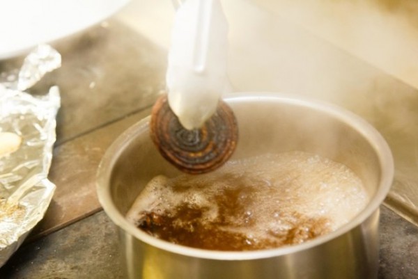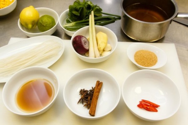 Красный лук слегка обжарить, чтобы он потемнел, а затем добавить в закипающий говяжий бульон. Туда же добавить корицу, бадьян, имбирь, стебли лемонграсса, сахар и чеснок.