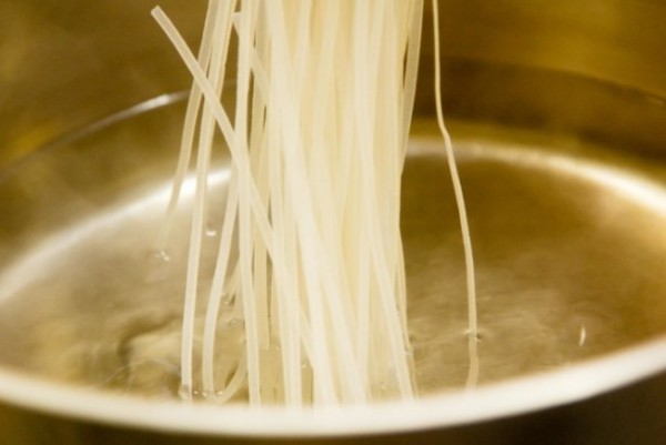 Отдельно отварить рисовую лапшу, выложить в тарелки.