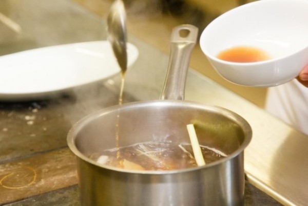 Репчатый лук мелко нарезать, добавить в бульон вместе с рыбным соусом. Если вкус получается чересчур насыщенным, можно слегка разбавить бульон водой.