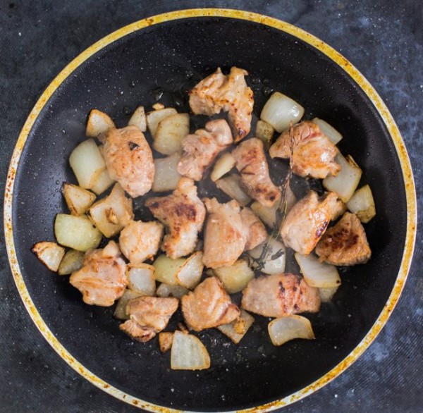 Обжарить лук и свинину в сковороде на растительном масле до золотистой корочки в течении 6-7 минут на среднем огне.