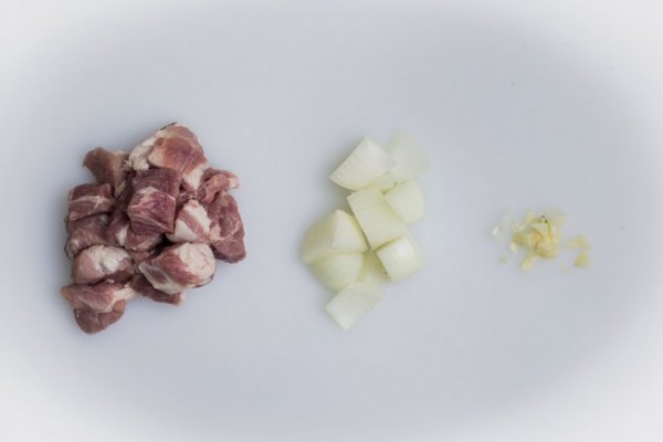 Нарезать свинину и лук крупным кубиком, чеснок мелко порубить.