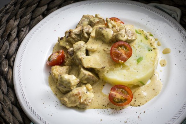 Выложить картофель на тарелку, сверху – свинину, полить соусом, украсить помидорами черри. Приятного аппетита!