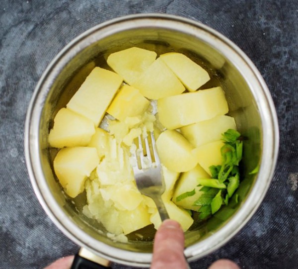Картофель очистить, произвольно нарезать и отварить. Затем слить воду, добавить соль и нарезанный зеленый лук, размять картофель вилкой.