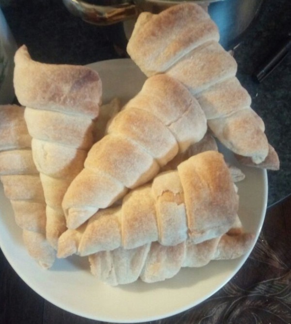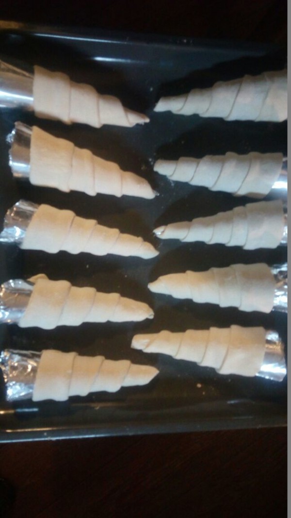 Тесто (у меня 2 прямоугольника) немного раскатываем, обрезаем неровные края и режем каждый пласт на 5 прямоугольных полосок. Накручиваем на наши конусы и выпекаем при температуре 220-230 градусов 15-20 мин. Обрезки теста тоже в духовку, это будет обсыпка на крем.