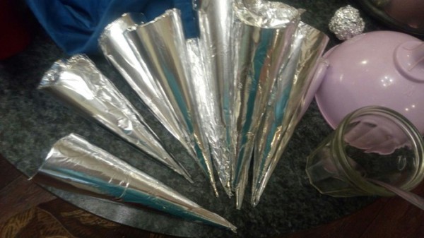 Конусы для трубочек я сделала сама, из пол-литровых жестяных банок . Скрутить трубочкой, закрепить, обмотать пищевой фольгой. На противень идеально влезает 10 шт.