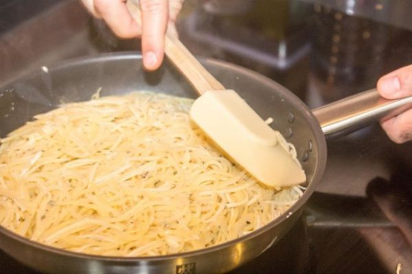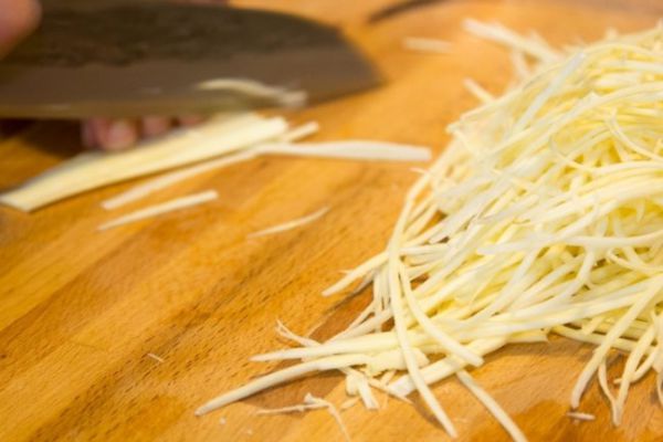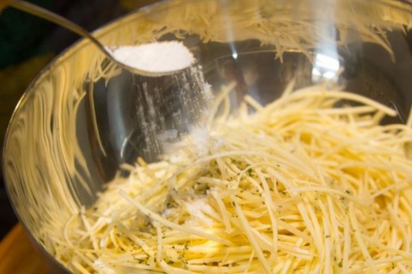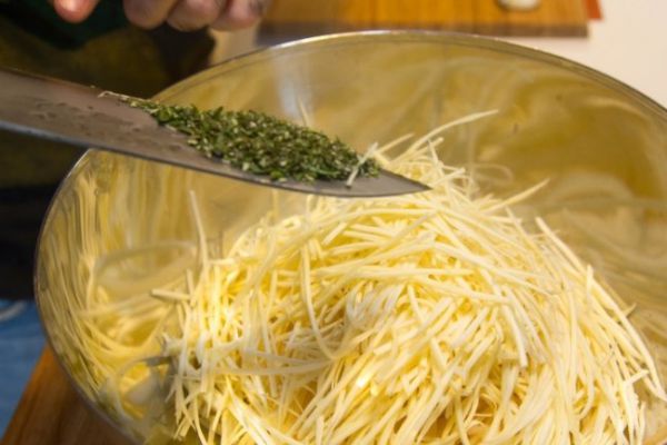 Для приготовления драников мы советуем добавить в компанию к картофелю пастернак или морковь. Овощи можно натереть и на терке (но так картофель даст много сока, который надо будет слить), но лучше нарезать их ножом тонкой соломкой или настрогать на мандолине.