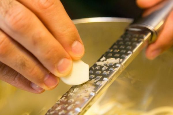 На мелкой терке натереть в миску чеснок.