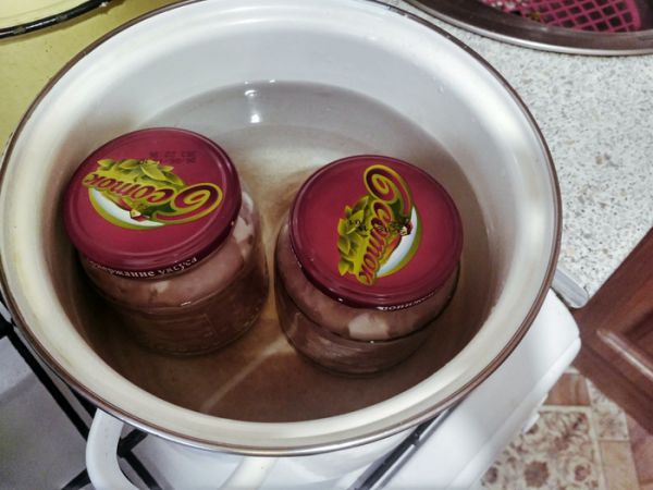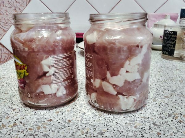 Добавляем соль, я ещё чесночек сухой добавила. Мешаем.Стерилизуем банки(у меня две винтовые по 0,75) в микроволновке. 5-6 минут на полной мощности. В каждую банку кладете 1 лавровый лист и по 3 горошинки перца чёрного и душистого. И укладываем плотненько мясцо. Приминаем, чтоб поплотнее было. Накрываем крышками и ставим в большую кастрюлю, наливаем в кастрюлю воды, чтоб доходила банке по плечики, включаем огонь и как только вода закипит, ставим огонь на минимум и варим. 5,5-6 часов. Примерно раз в 2 часа проверяем, не выкипела ли вода. Когда тушенка готова, закрываем стерилизованными крышками. Всё готово. Зимой я на балконе храню. Получается очень вкусно.