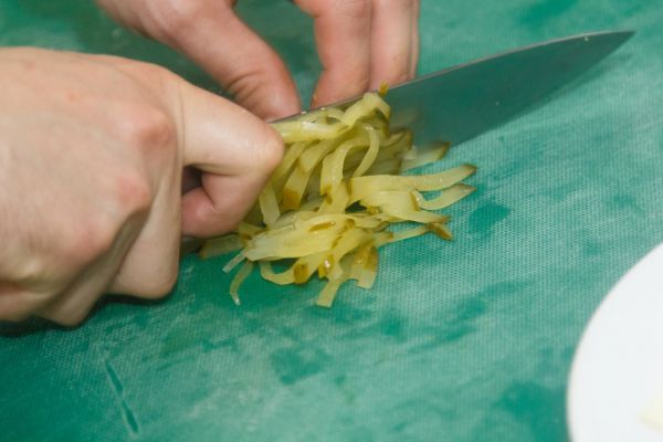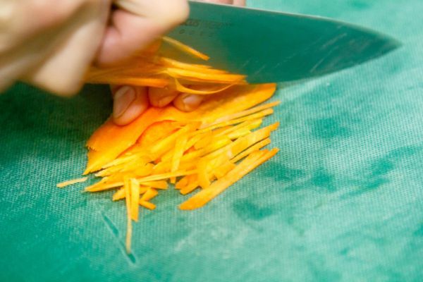 Курицу нарезать соломкой и обжарить на разогретой сковороде с растительным маслом.