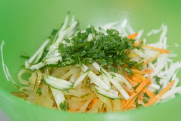Соединить нарезанные овощи в миске, добавить зелень и перемешать.