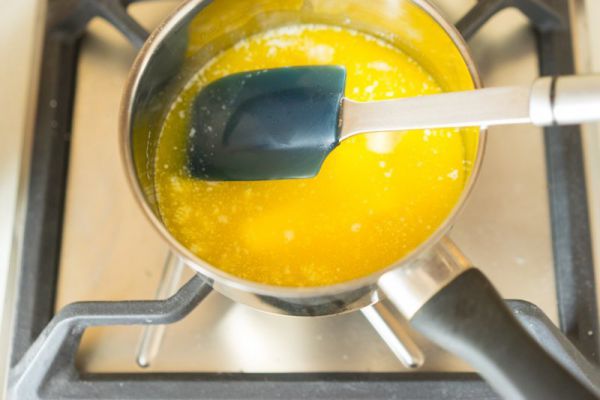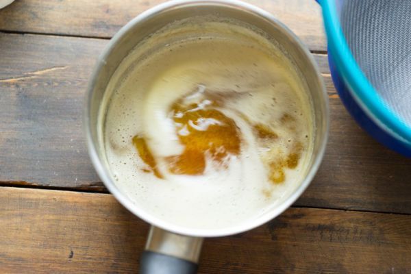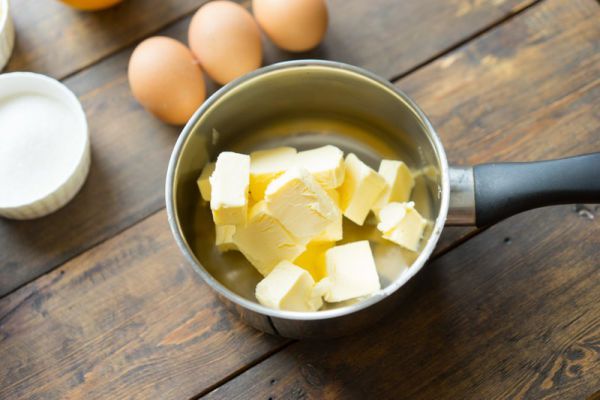 Растопить масло - 190 грамм. Вначале масло просто растопится, потом начнёт кипеть. Важно, чтоб огонь средний, иначе оно быстро сгорит. Через какое-то время на дне появится коричневый осадок, масло также слегка потемнеет и появится лёгкий ореховый запах.