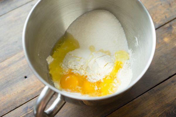 В это время муку - 1.5 стакана, сахар - 3/4 стакана и три яйца до однородной слегка пышной массы.