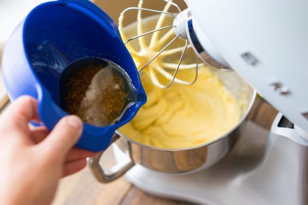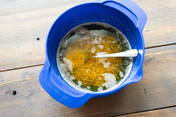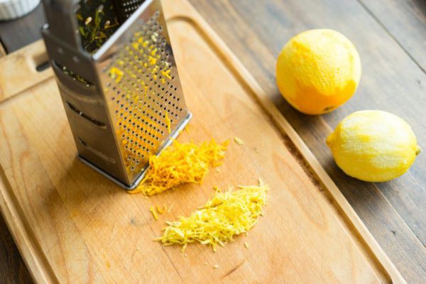 Цедру на мелкой тёрке и короткой стружкой, чтоб не было ощущения присутствия в готовом продукте.