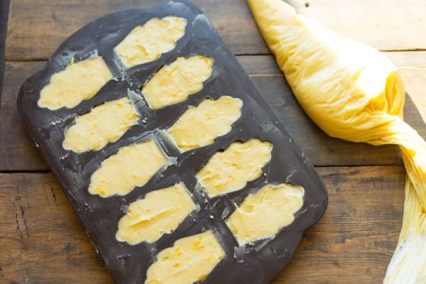 Далее - тесто в мешок - для удобства, смазать (можно не мазать) и наполнить формы - бывают силиконовые и металлические. Наполнять без воздушных полостей и без горки. Нет форм - сойдут бумажные для кексов-маффинов.