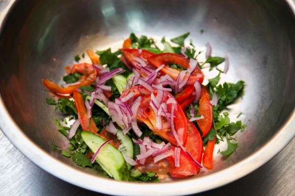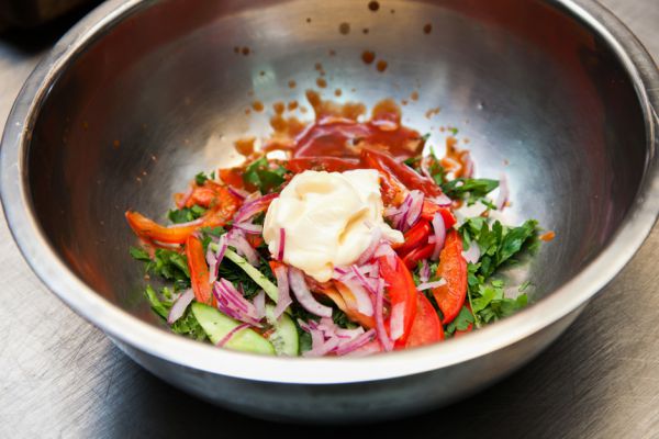 Соединить овощи (кроме картофеля) и зелень в миске.