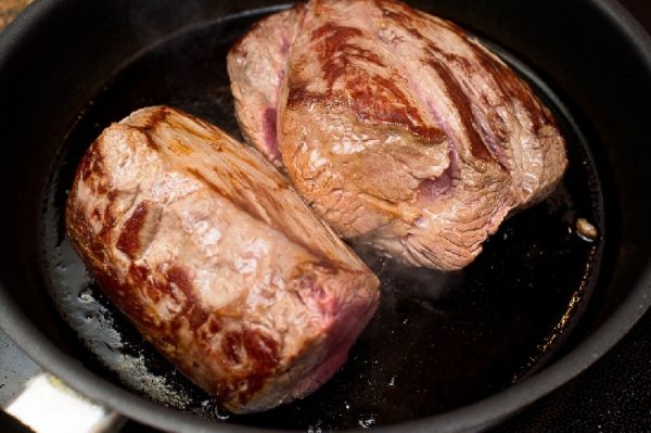 Вырезку очистить от пленок, обсушить. Если мясо не очень хорошо держит форму, обвязать кулинарным шпагатом. Хорошо раскалить большую сковородку, плеснуть немного масла и обжарить мясо со всех сторон (даже с торцов, придерживая мясо вилками, щипцами или лопаткой) до румяной корочки.