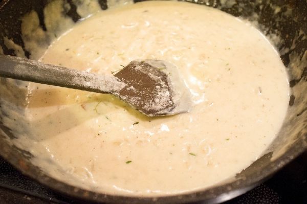 Добавить ложку-полторы муки, перемешать, влить молоко и готовить, постоянно помешивая венчиком, до загустения. Посолить, поперчить.