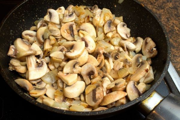 На другой сковородке на среднем огне разогреть растительное масло, добавить сливочное, растопить. Шампиньоны нарезать пластинами, лук произвольно. Обжарить грибы с луком до золотистого цвета, посолить, поперчить.