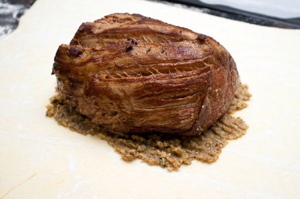 В центр выложить немного грибной пасты. Положить сверху мясо.