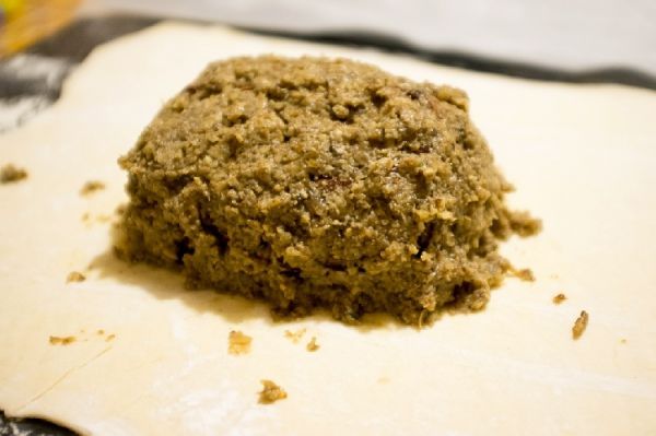 Плотно обмазать оставшейся пастой. Смазать края теста слегка взбитым яйцом и произвольно защипать пирожок.