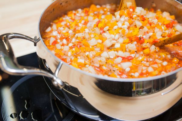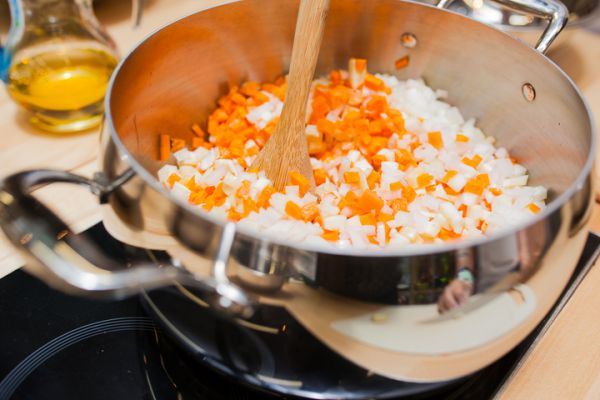 Обжарить лук, морковь и сельдерей на растительном масле.