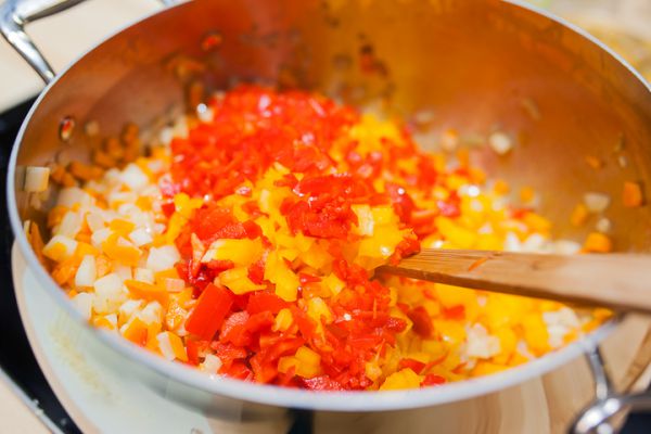 Добавить болгарский перец и помидоры или томатную пасту, слегка обжарить.