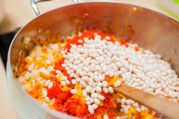 Добавить фасоль, залить 2 стаканами воды и тушить 1 час (бобы фасоли нужно всегда варить на медленном огне).