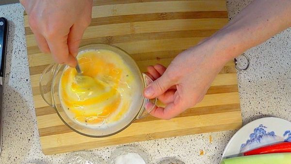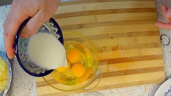 В миску разбиваем 3 яйца и добавляем к ним 5 столовых ложек молока.