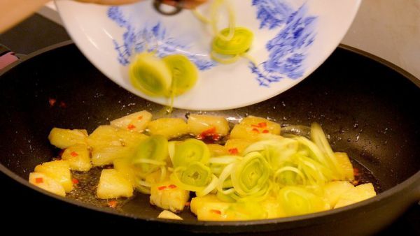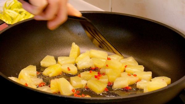 В сковороде разогреваем растительное масло и обжариваем ананасы с чили на сильном огне до лёгкого зарумянивания. Вместе с ними можно обжарить лук-порей, но я предпочитаю видеть его в блюде почти свежим, поэтому добавляю позже.
