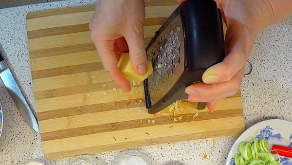 Кусочек любого вашего любимого сыра натираем на крупной тёрке.