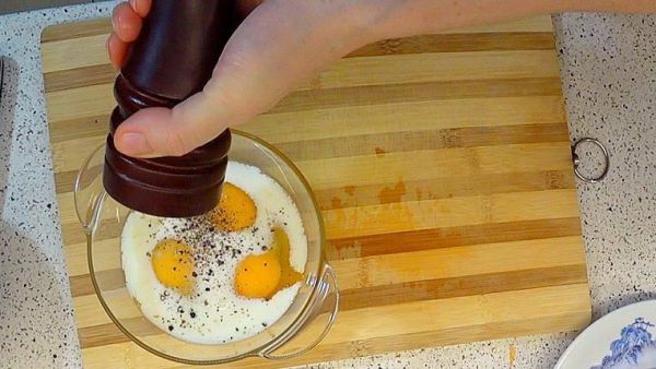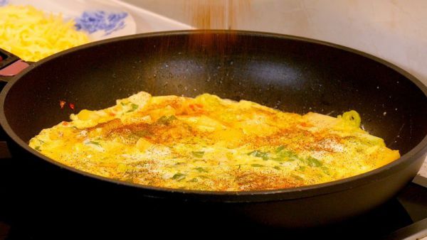 Когда яйца запеклись, открываем крышку, посыпаем омлет паприкой.