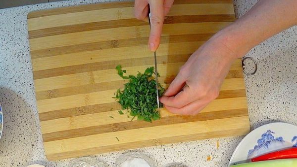 Нарезаем произвольное количество петрушки и добавляем к яичной смеси.