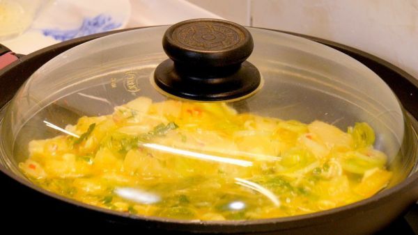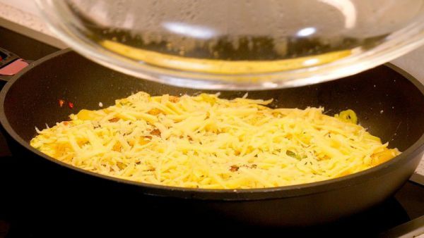 Перемешиваем, накрываем крышкой и печём до готовности яиц. Омлет в процессе можно периодически "ворошить", чтобы избежать пригорания и добиться лучшего пропекания.