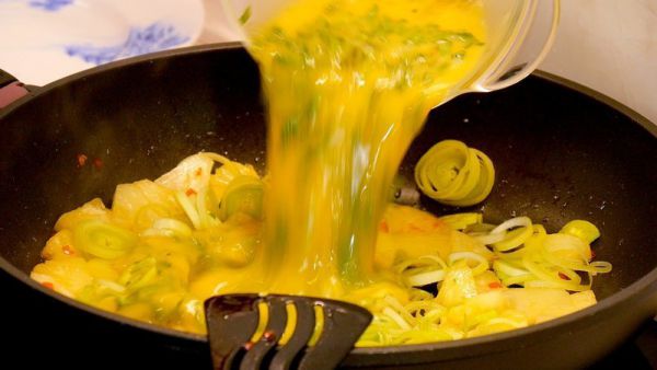 Но мы же экспериментаторы и в самом простом яйце будем искать потенциальный шедевр! :) И ведь находим! Вот, хотя бы этот омлет по-гавайски. Вроде бы ингредиенты совсем простые и доступные: ананасы, чили, порей. И заливка вроде бы стандартная: яйца, молоко да петрушка... А результат просто великолепен, и дегустаторы требуют повторения :)