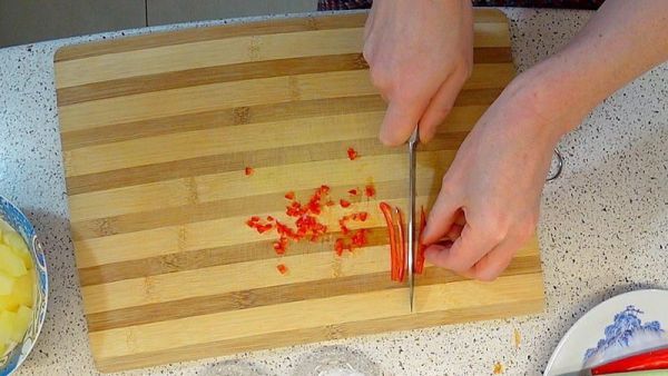 Готовим на двоих. Все пропорции на глаз и вкус, но некоторые всё-таки выразим в цифрах :) Возьмите 100 грамм свежего или консервированного ананаса. Порежьте кусочками. Небольшой кусочек перца чили мелко нарезаем и отправляем к ананасам.