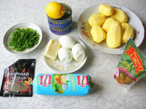 5. На дно слоями выкладываем половину тунца, затем яйца, оливки и оставшийся тунец, последний слой — картофельное пюре.