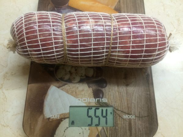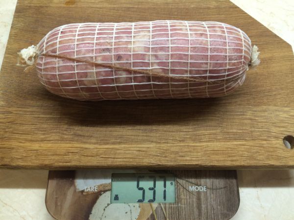 Завернул в коллагеновую плёнку, потом обтянул сеткой и обвязал. Чтобы не перепутать, батон без химии промаркировал другой обвязкой (первое фото). Готовые батончики отправил ещё на сутки в холодильник.