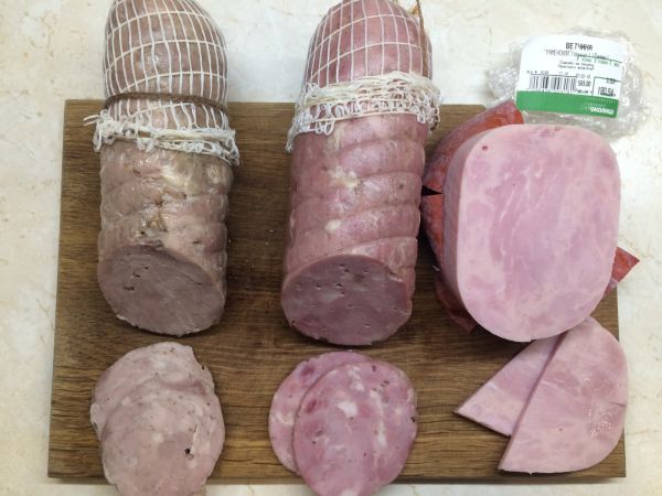 2 претендент (с химией) - да, это ветчина. Режется относительно туго, плотная структура, эластичная, сочная.