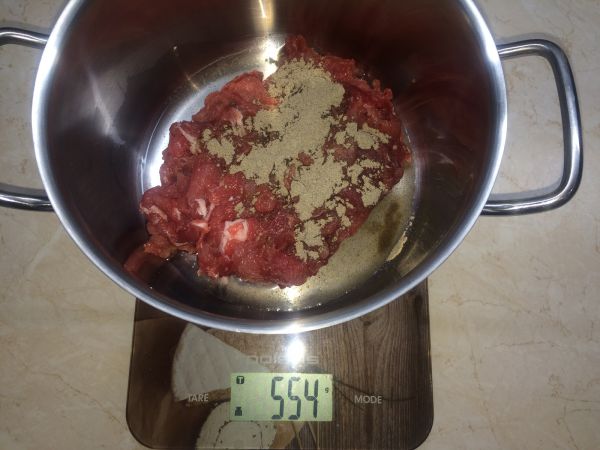 На следующий день в каждый фарш добавил по 50 мл воды, 3-4 грамма смеси специй (глюкоза, черный перец, кориандр) и в фарш с нитритной солью 2 грамма фосфатов.