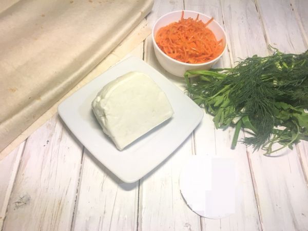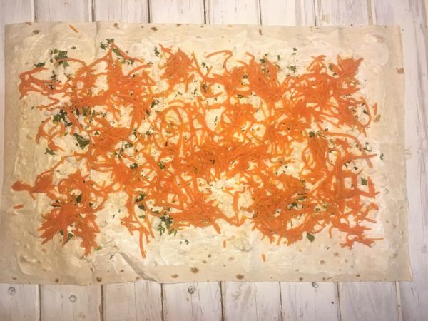 Лаваш смазать сметаной и майонезом, разложить равномерно морковь, зелень и сыр.