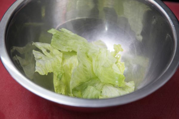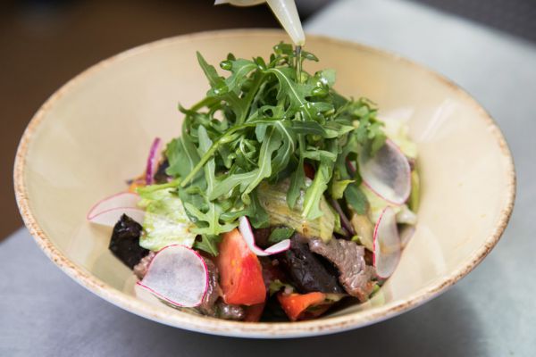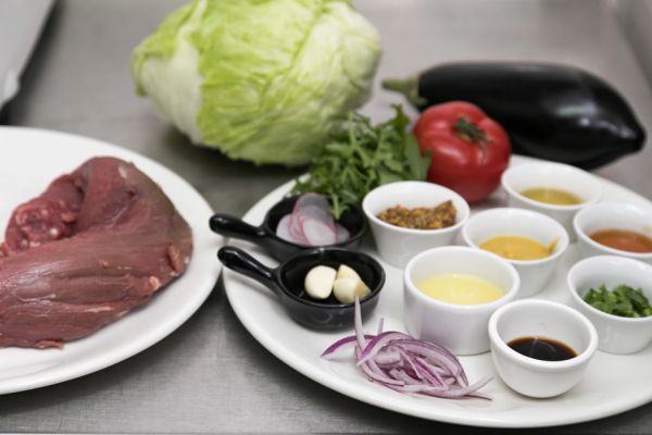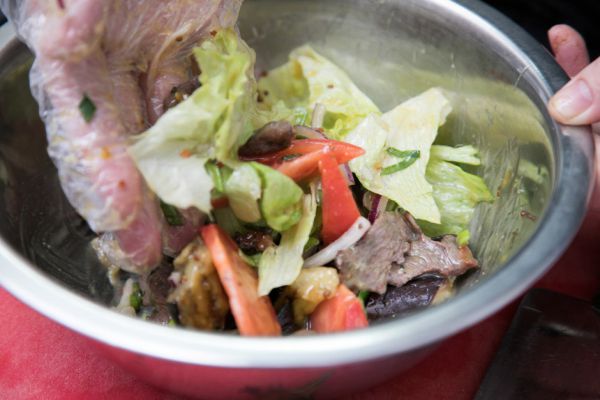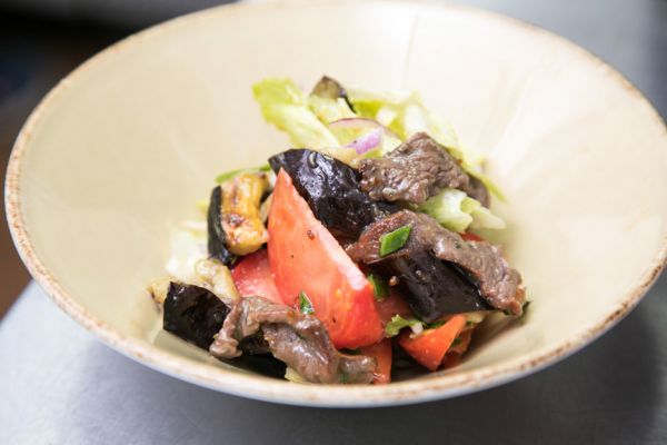 Смешать запеченный баклажан, говядину, салат айсберг, нарезанный большой лапшой красный лук и томаты крупными дольками. Заправить горчично-медовым соусом.