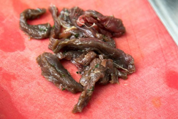 Говядину, нарезанную соломкой, замариновать в чесночном масле, соли, перце, соевом соусе (2г), сахаре, рубленой зелени, оставить на 2 минуты.