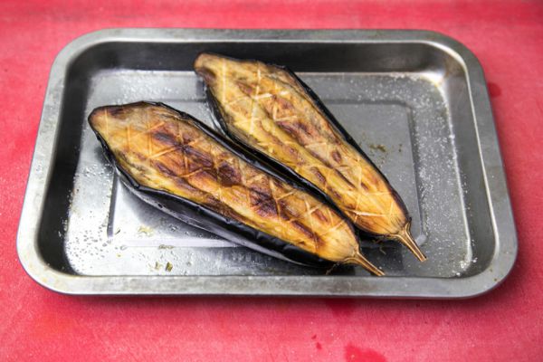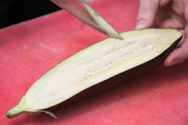 Баклажан разрезать вдоль, сбрызнуть оливковым маслом.
