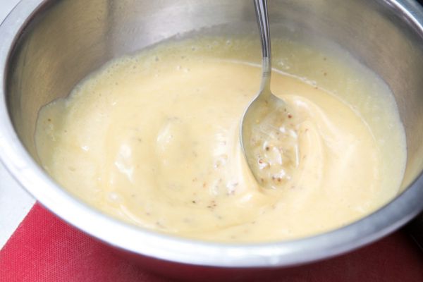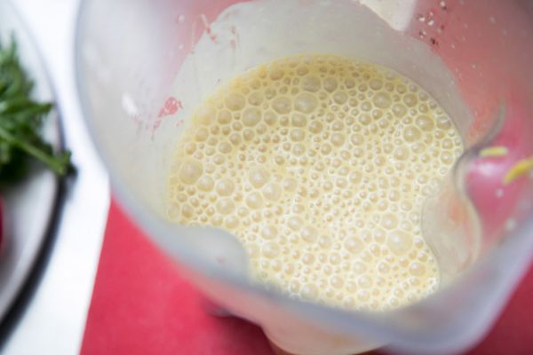 В блендере соединить 6г оливкового масла, мед, горчицу, лимонный сок, чеснок, 2г соевого соуса и пробить 1 минуту.