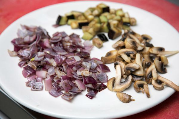 Баклажаны, грибы и красный лук нарезать мелким кубиком и отдельно обжарить на сковороде.